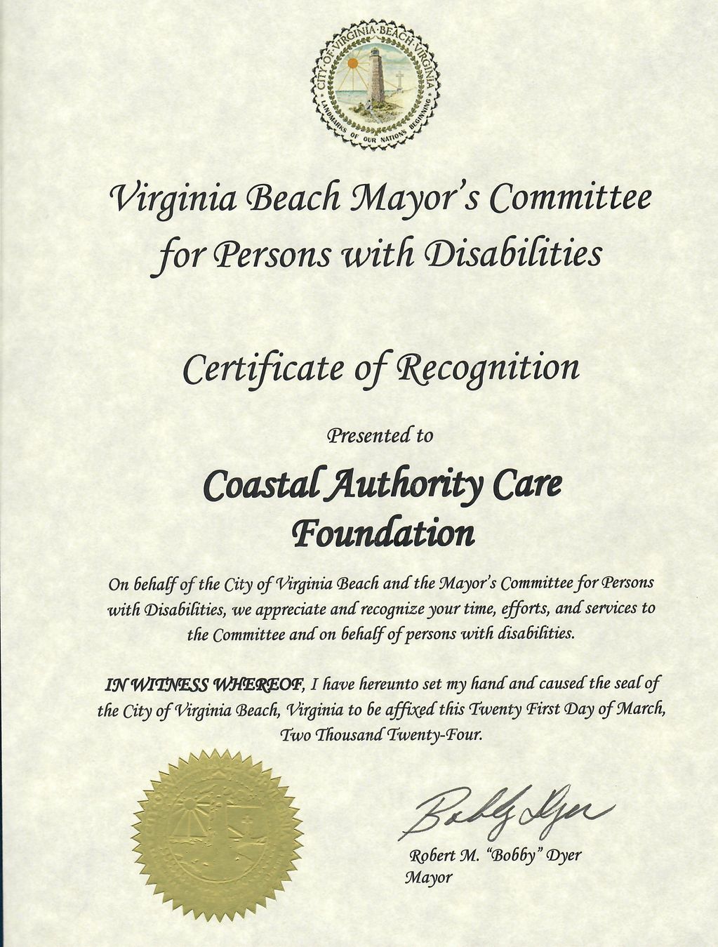 In March 2024, CACF received an award from City of Virginia Beach Mayor Bobby Dyer recognizing the work we are doing to help local disabled veterans heal the invisible wounds.